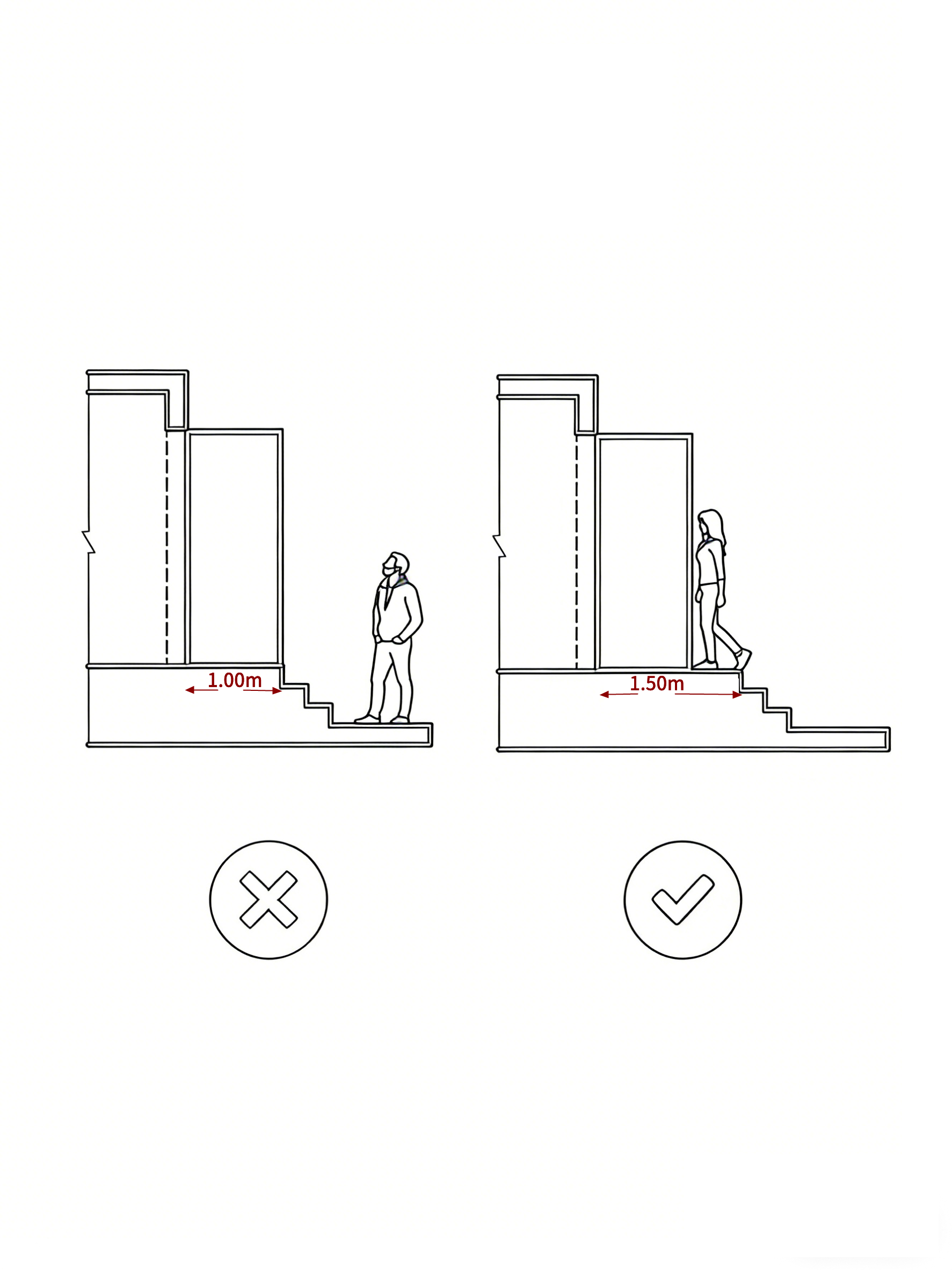 楼梯:台阶前预留≥1.5m 缓冲空间,优化上下楼动线与安全性。