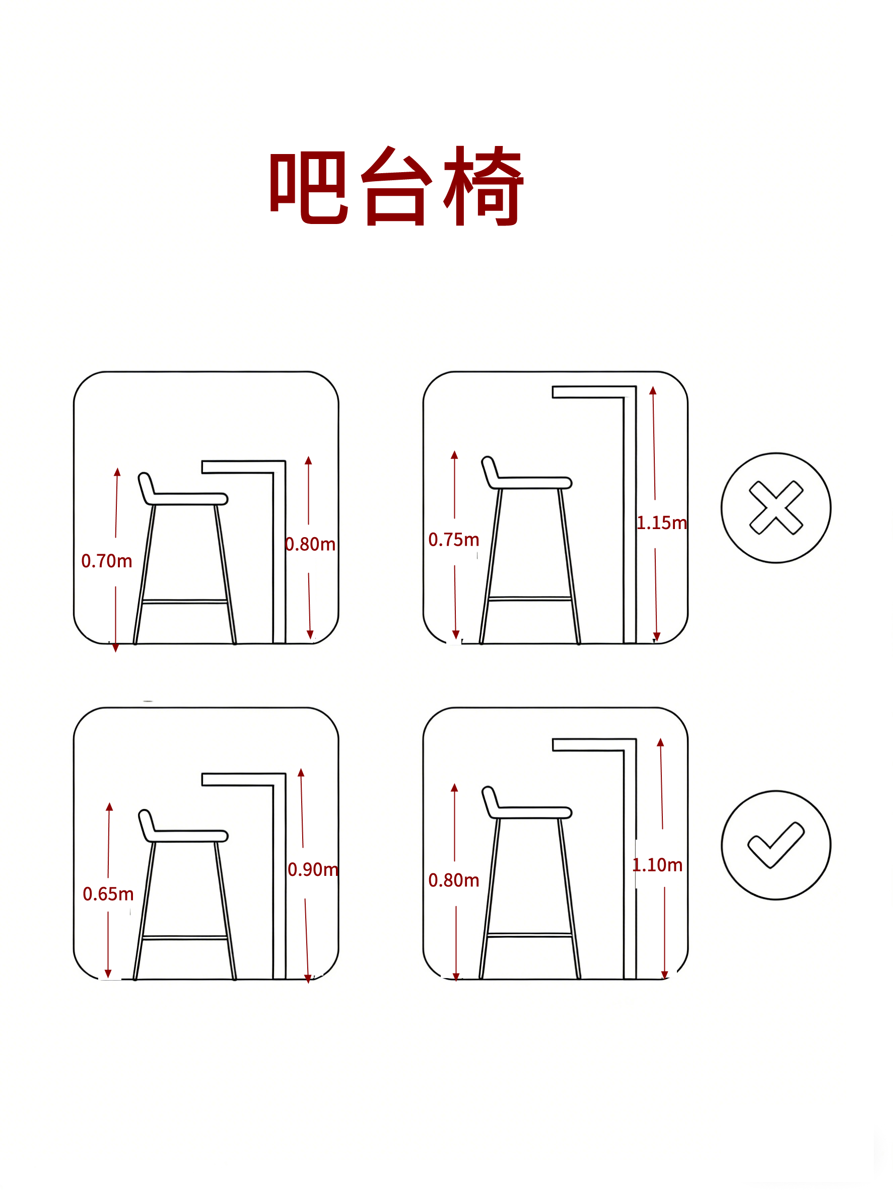 吧台椅:椅高 0.8m,吧台高度 1.1m,坐姿更符合人体工学。