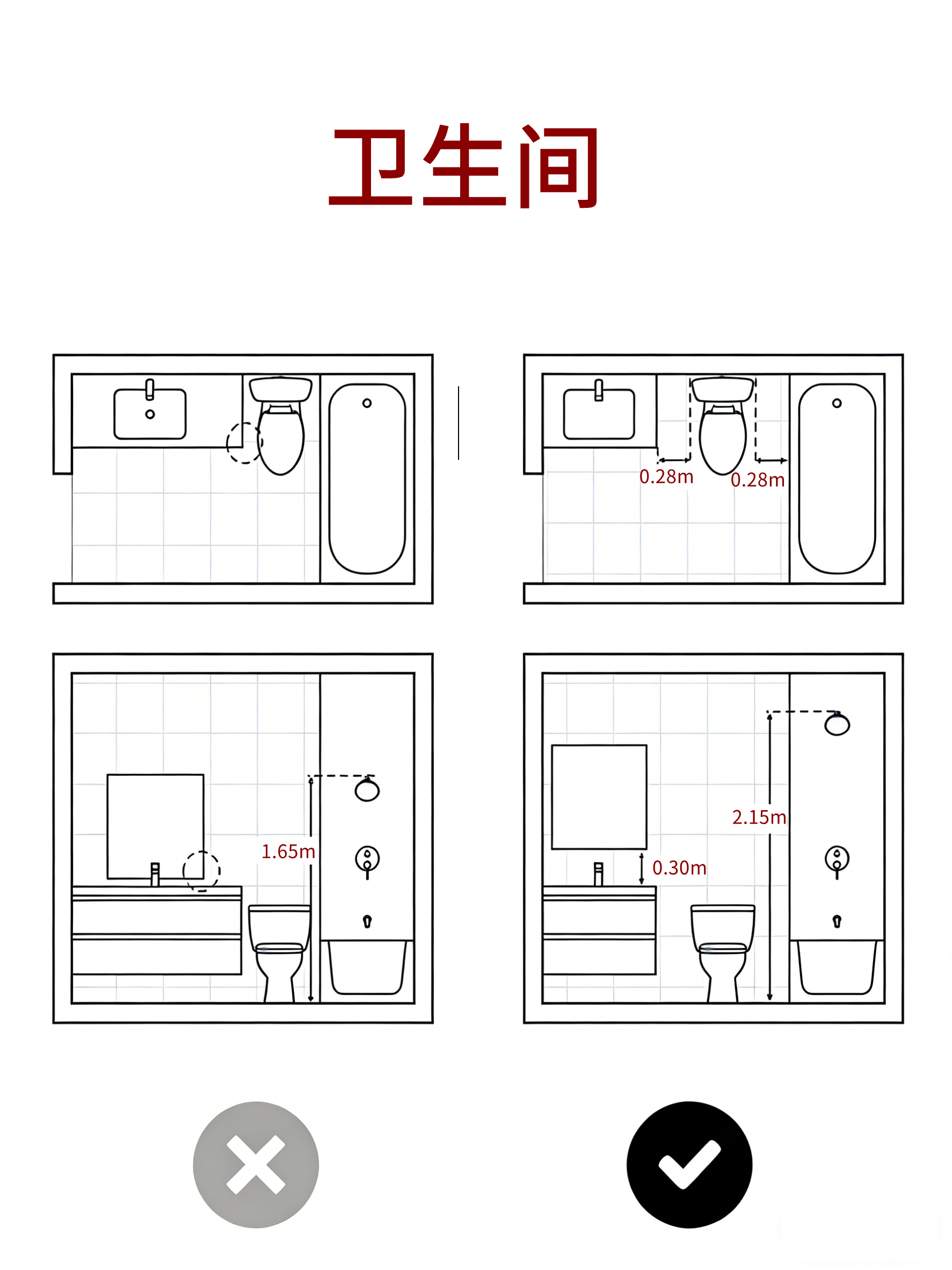 卫生间:马桶两侧预留舒适宽度,淋浴区高度≥2.15m,空间更舒展。