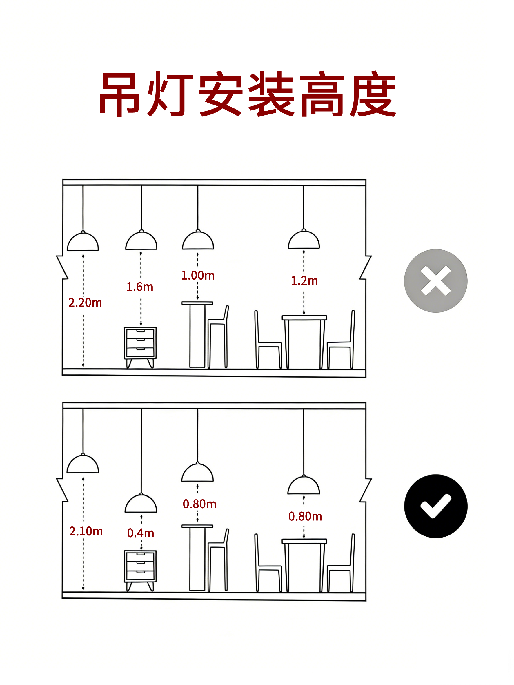 吊灯:餐桌、吧台吊灯距台面 0.8m,照明与防碰头兼顾。