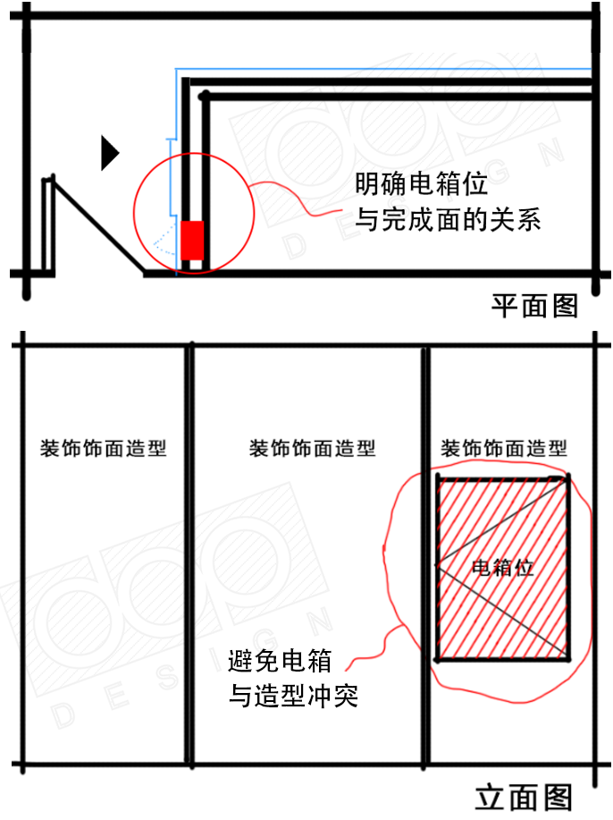 3.设计师需根据系统图和平面图提供的电箱信息,判断电箱的位置,大小,安装方式是否合适,明装还是暗装,是否与周边的装饰冲突,电箱门是否能顺利打开等等内容。