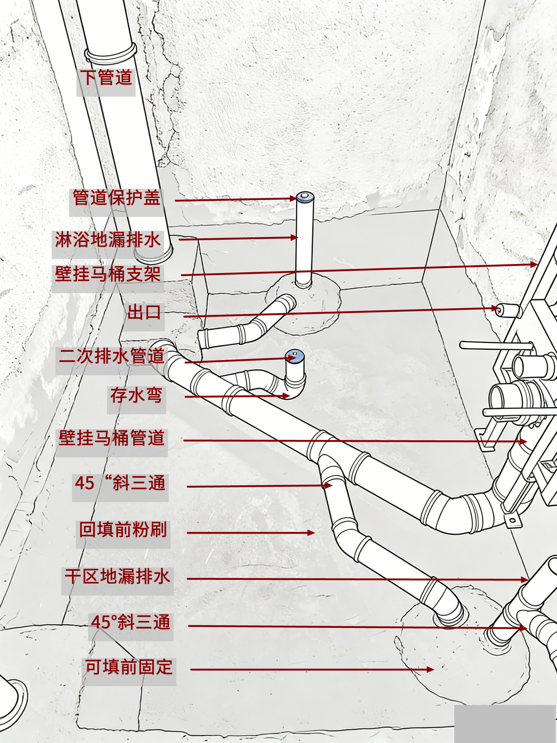 细部预处理:排水孔、管根等易渗漏部位,用堵漏王做圆弧填充;墙地交界同样做抹弧处理,消除尖锐边角,让防水能均匀覆盖缝隙。