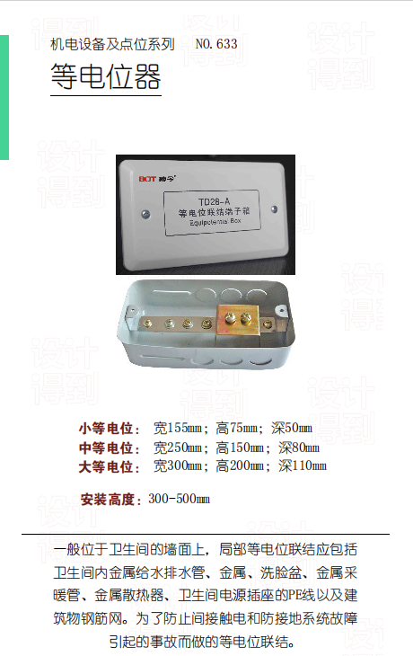 卫生间的安全防线 尺寸:分小 / 中 / 大三种,小等电位 155×75×50mm,中等电位 250×150×80mm,大等电位 300×200×110mm。