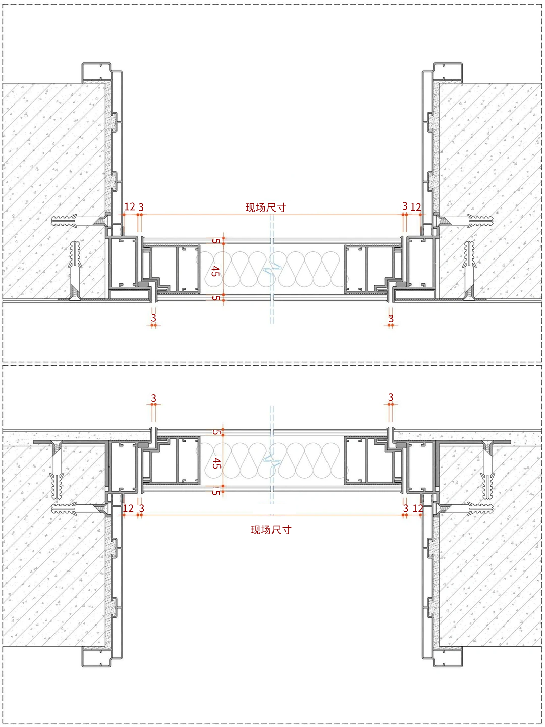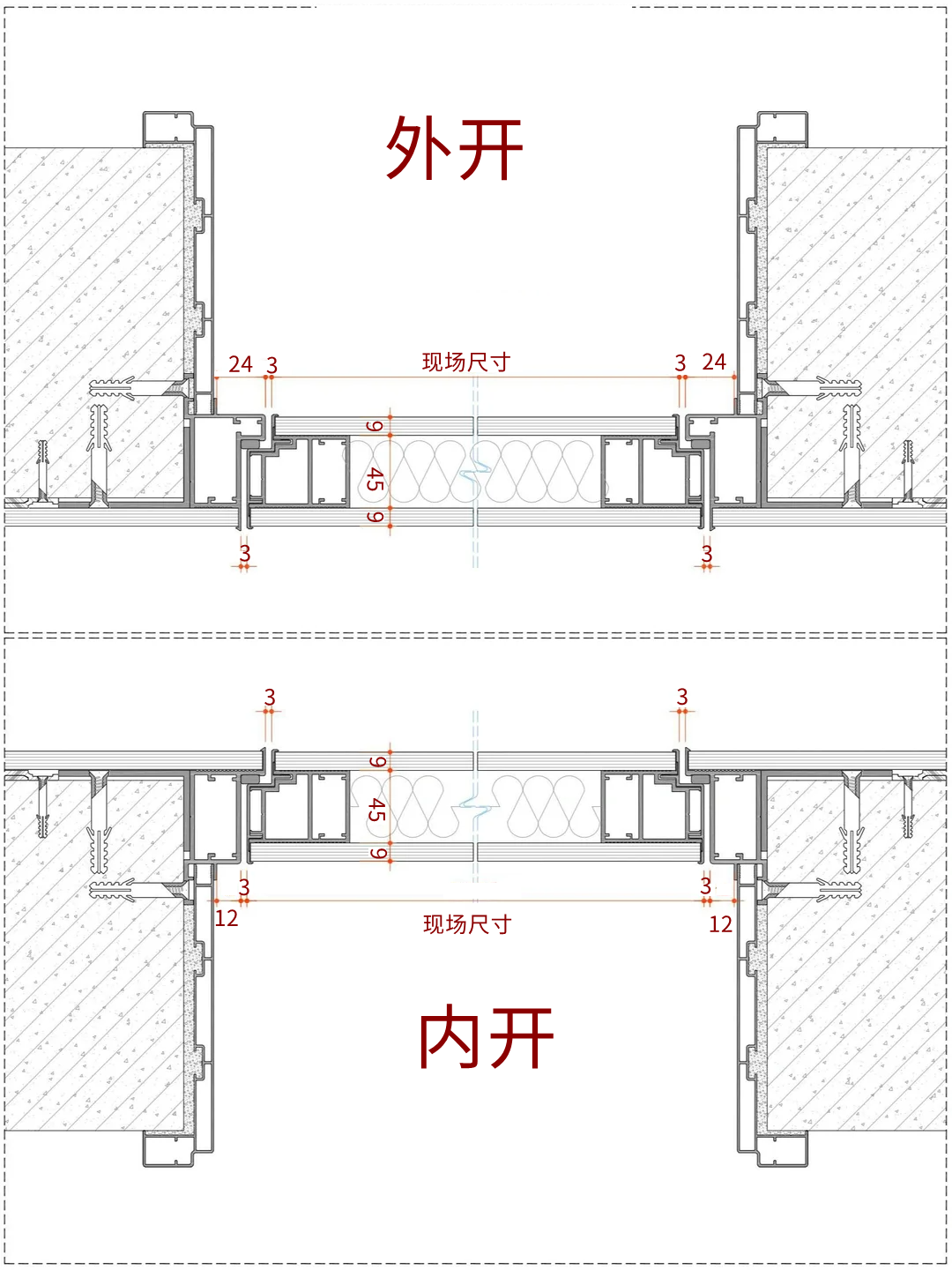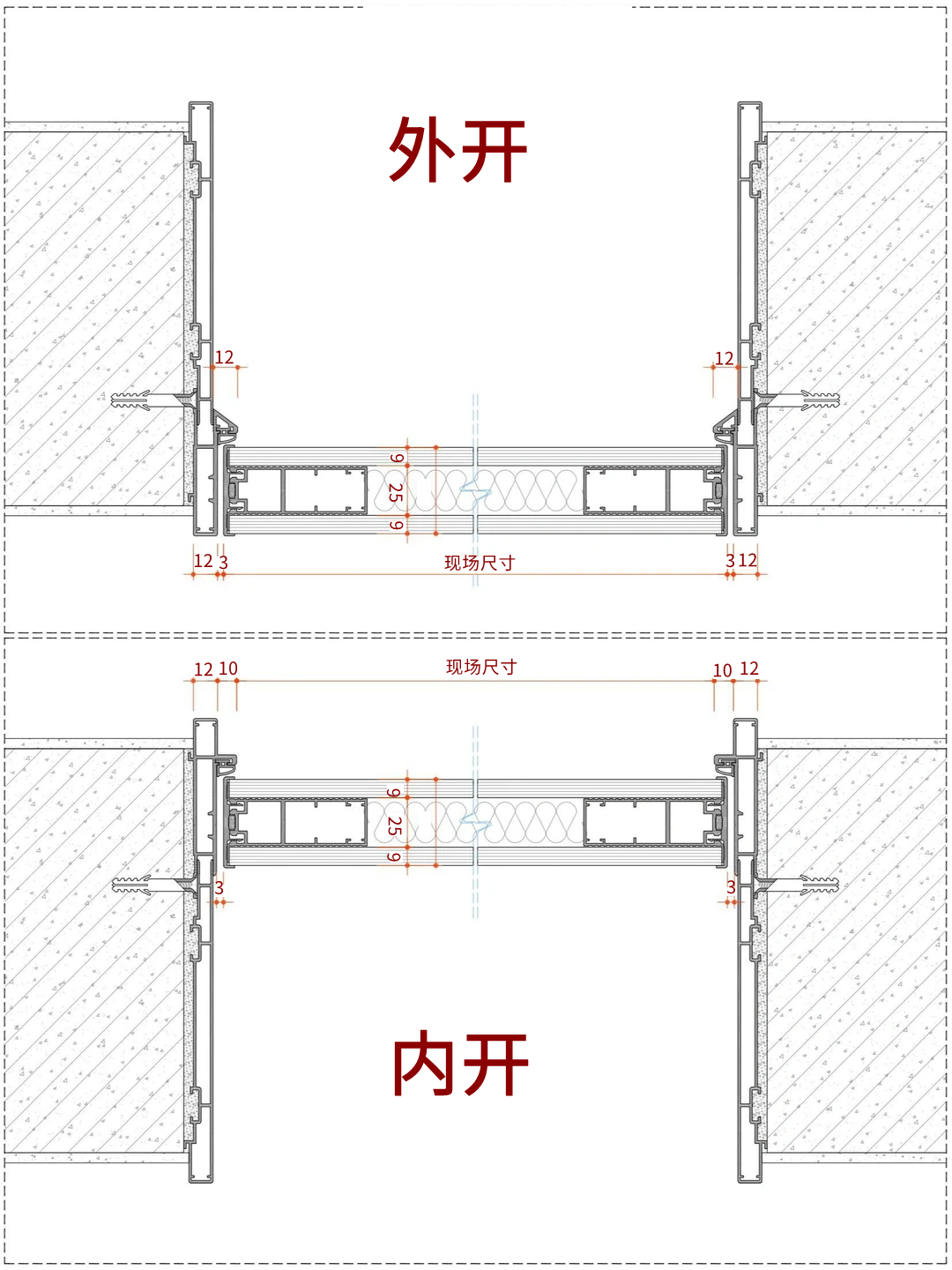 外开与内开两种方式对应不同节点尺寸,外开时门框与墙体留 3mm 缝,内开时调整为 12mm,既满足五金开合需求,又能隐藏缝隙;搭配隐形门铰与自动回弹装置,实现无把手、自动闭合的极简效果。