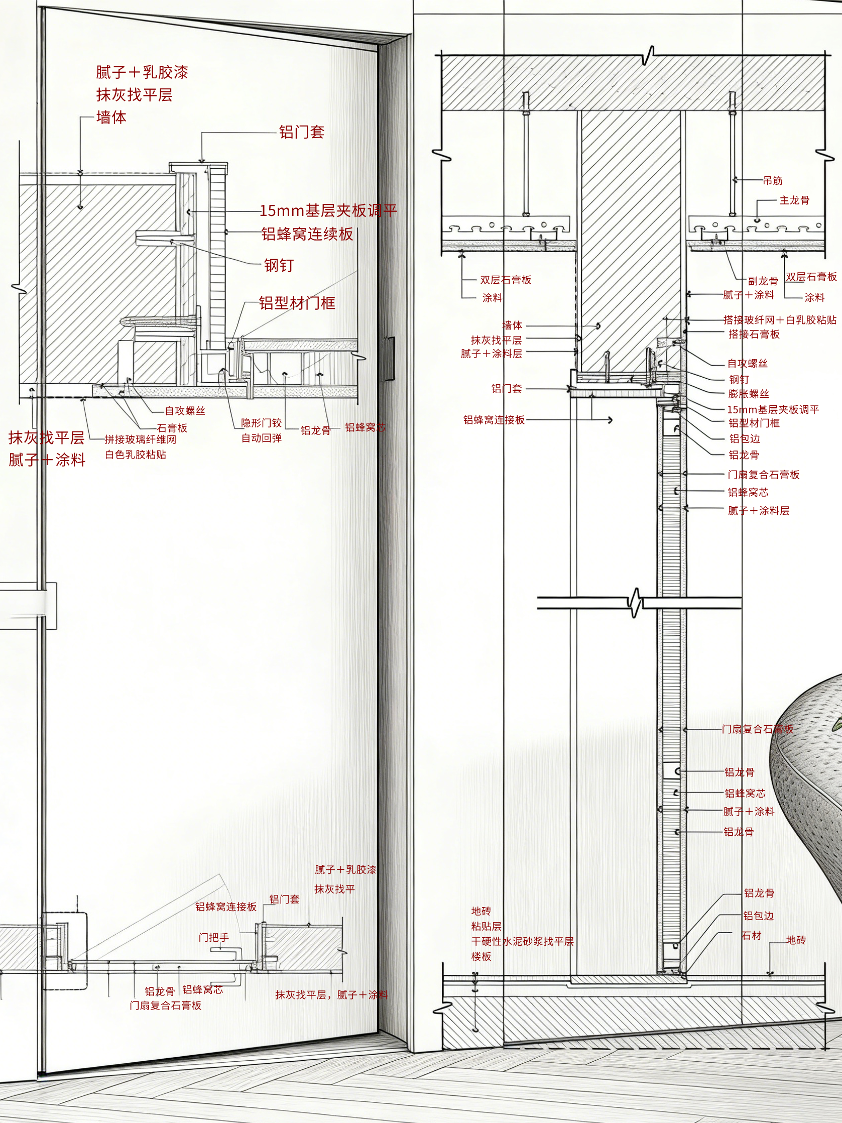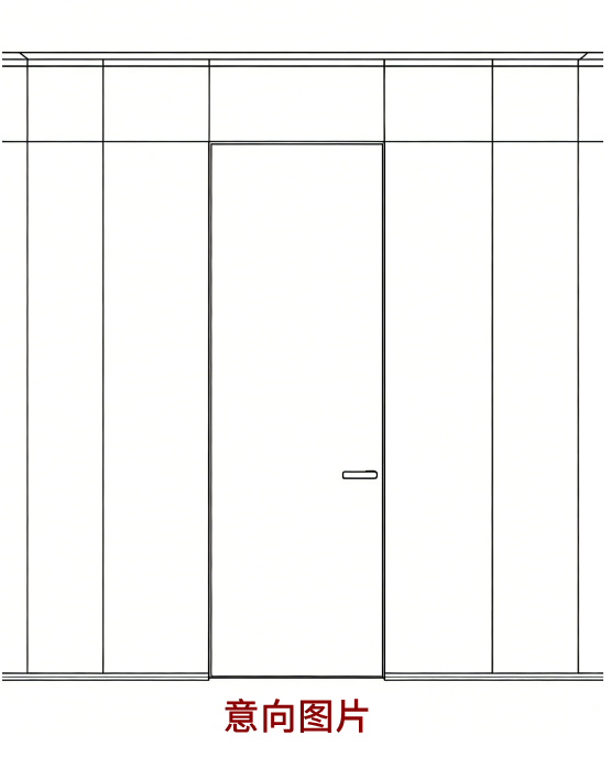 门板与墙面统一采用腻子 + 乳胶漆 / 木饰面,通过铝蜂窝连接板过渡,让门与墙面在材质、颜色、纹理上完全一致,视觉上消弭门的存在;底部与地面、顶部与吊顶的收口,同样通过精密尺寸控制,做到 “见光不见缝”。