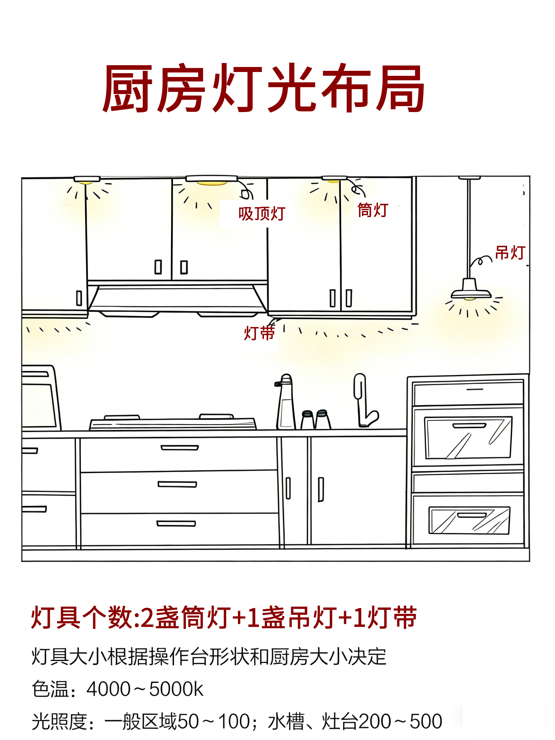 厨房重点照亮水槽和灶台,加条灯带避开操作阴影;
