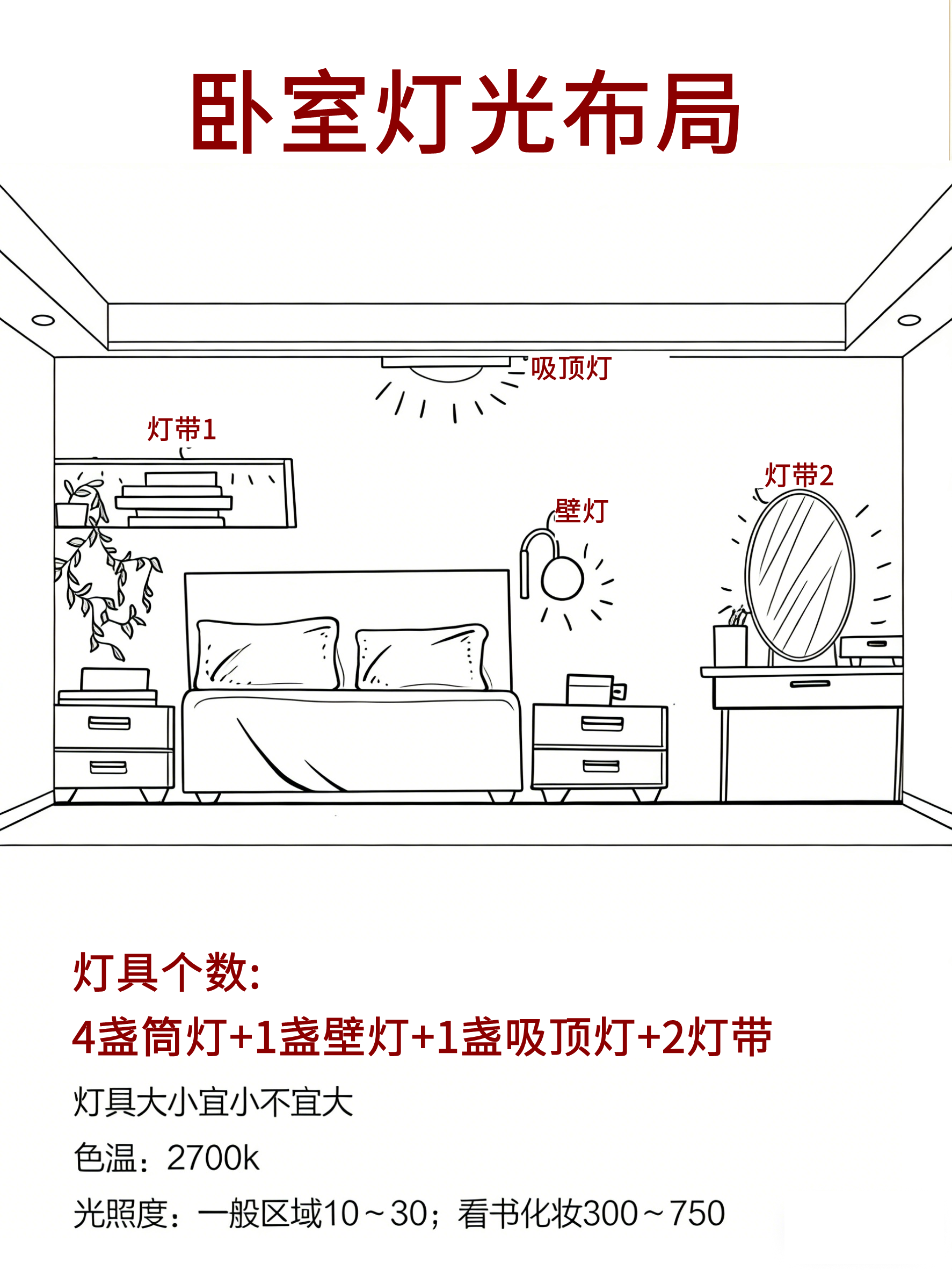 卧室少用强光,筒灯+壁灯+灯带就足够;