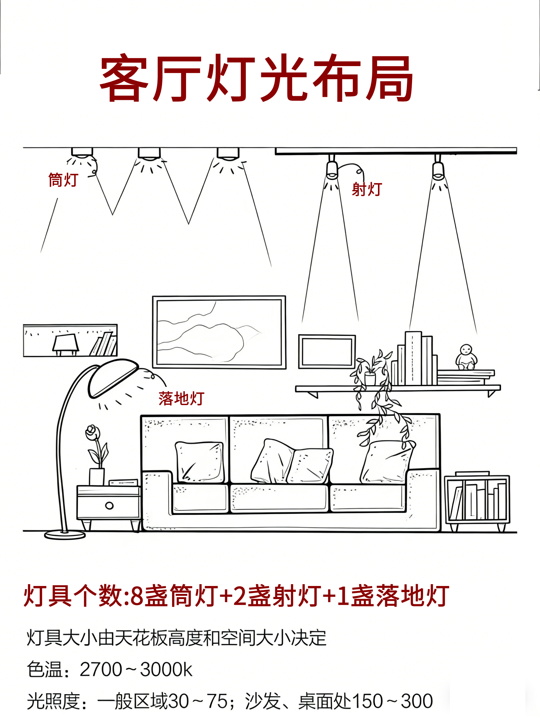 简单说下各空间布局:客厅用筒灯打基础,射灯突出细节,加一盏落地灯补氛围;