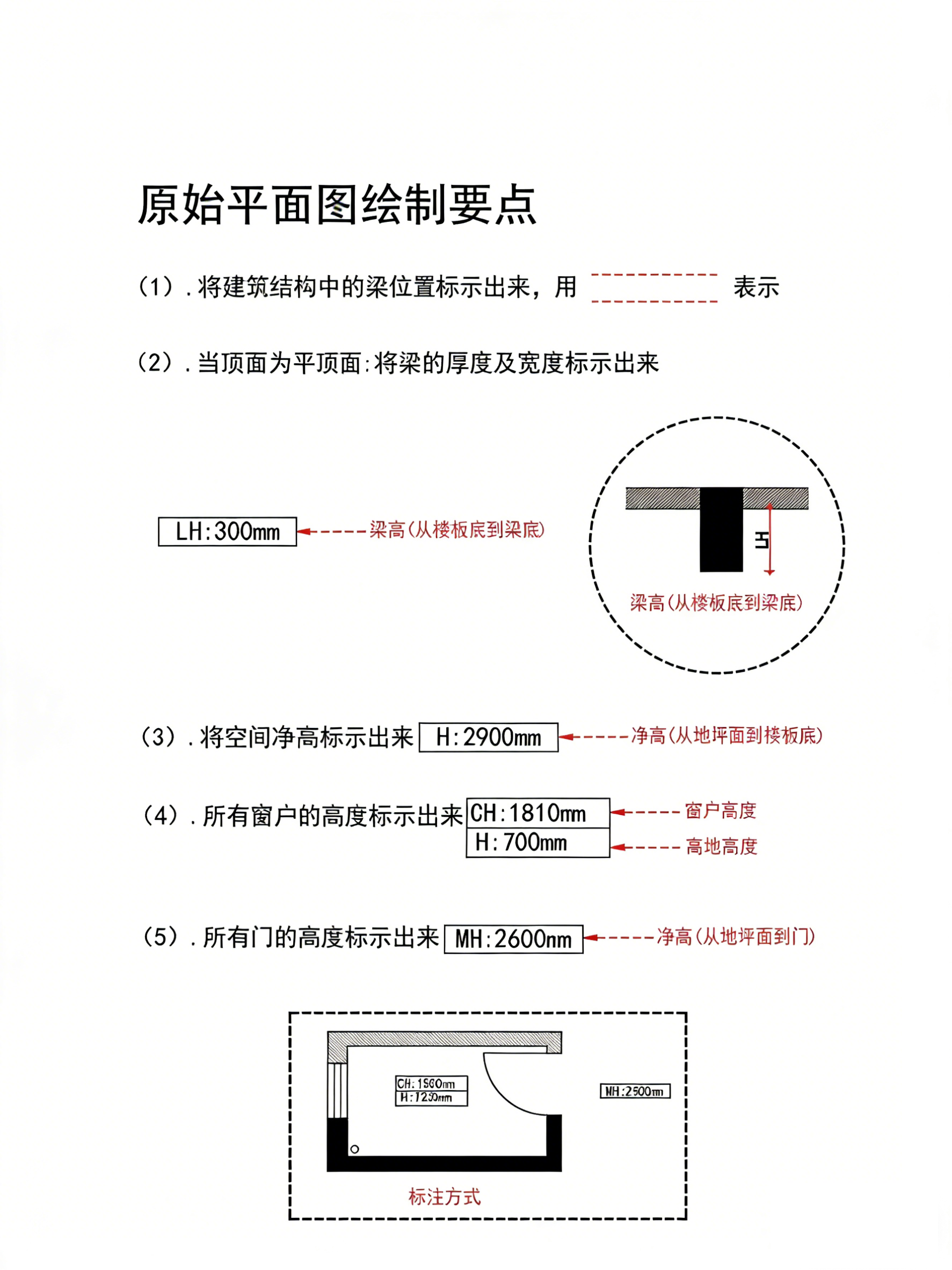 学会快捷键,下一步就是搞定原始平面图绘制—— 这是设计深化的基础。记住这几个核心要点,再也不用被吐槽 “图纸不专业”:用虚线清晰标注梁位,精准标注空间净高,门窗尺寸要细分,所有标注格式统一,一眼就能看懂。